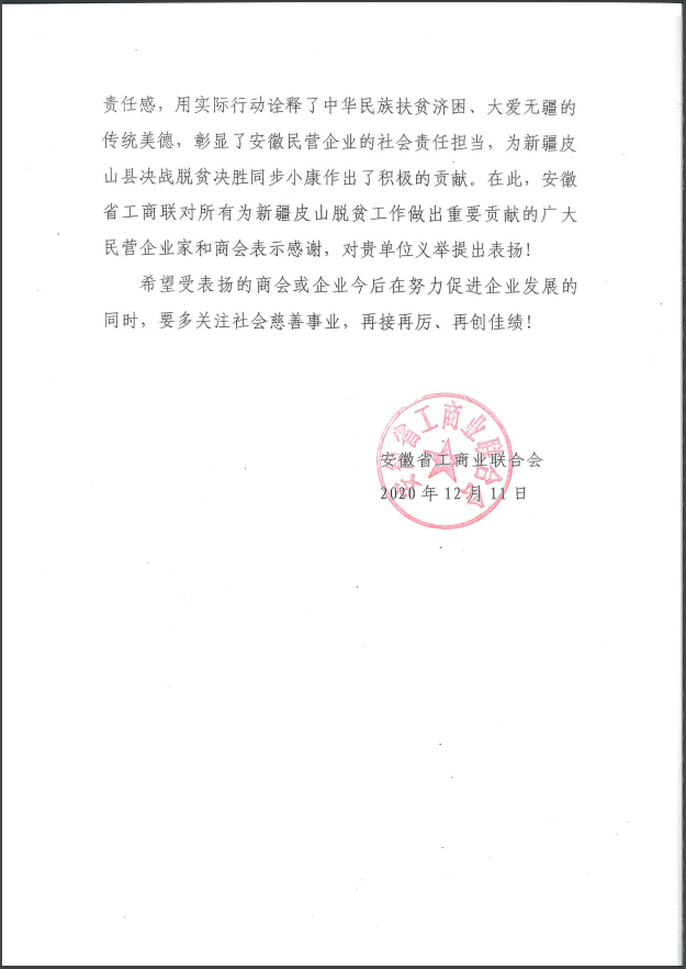 省工商聯(lián)在感謝信中對(duì)安徽天鷺控股集團(tuán)等所有為新疆皮山脫貧工作做出重要貢獻(xiàn)的廣大民營(yíng)企業(yè)家和商會(huì)表示感謝并提出表?yè)P(yáng)!