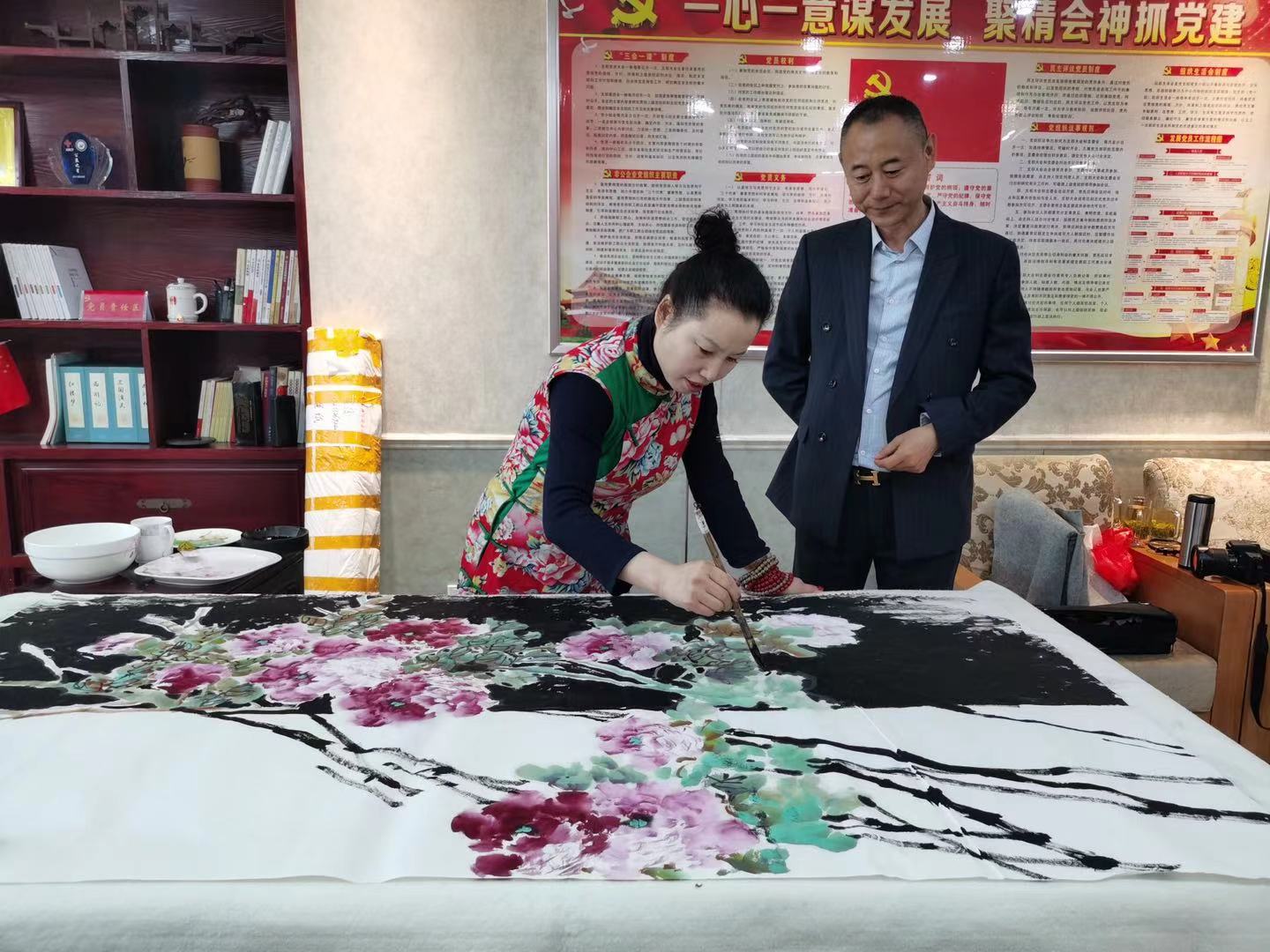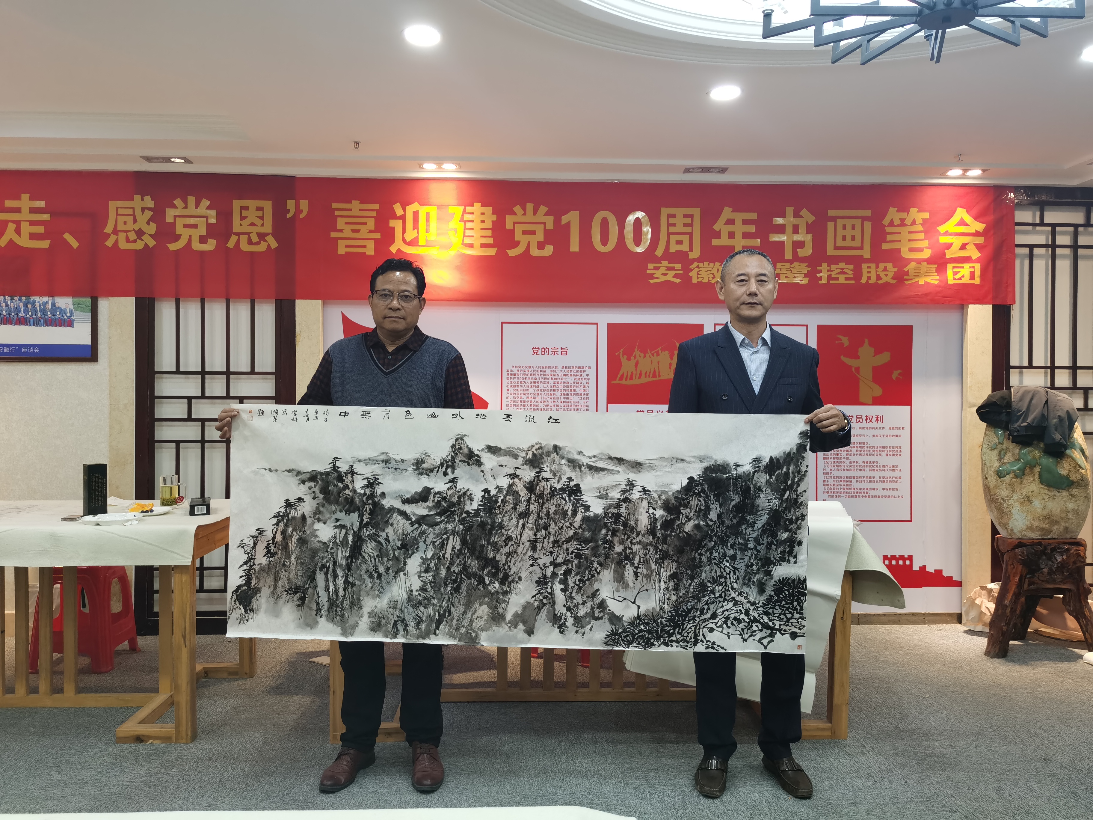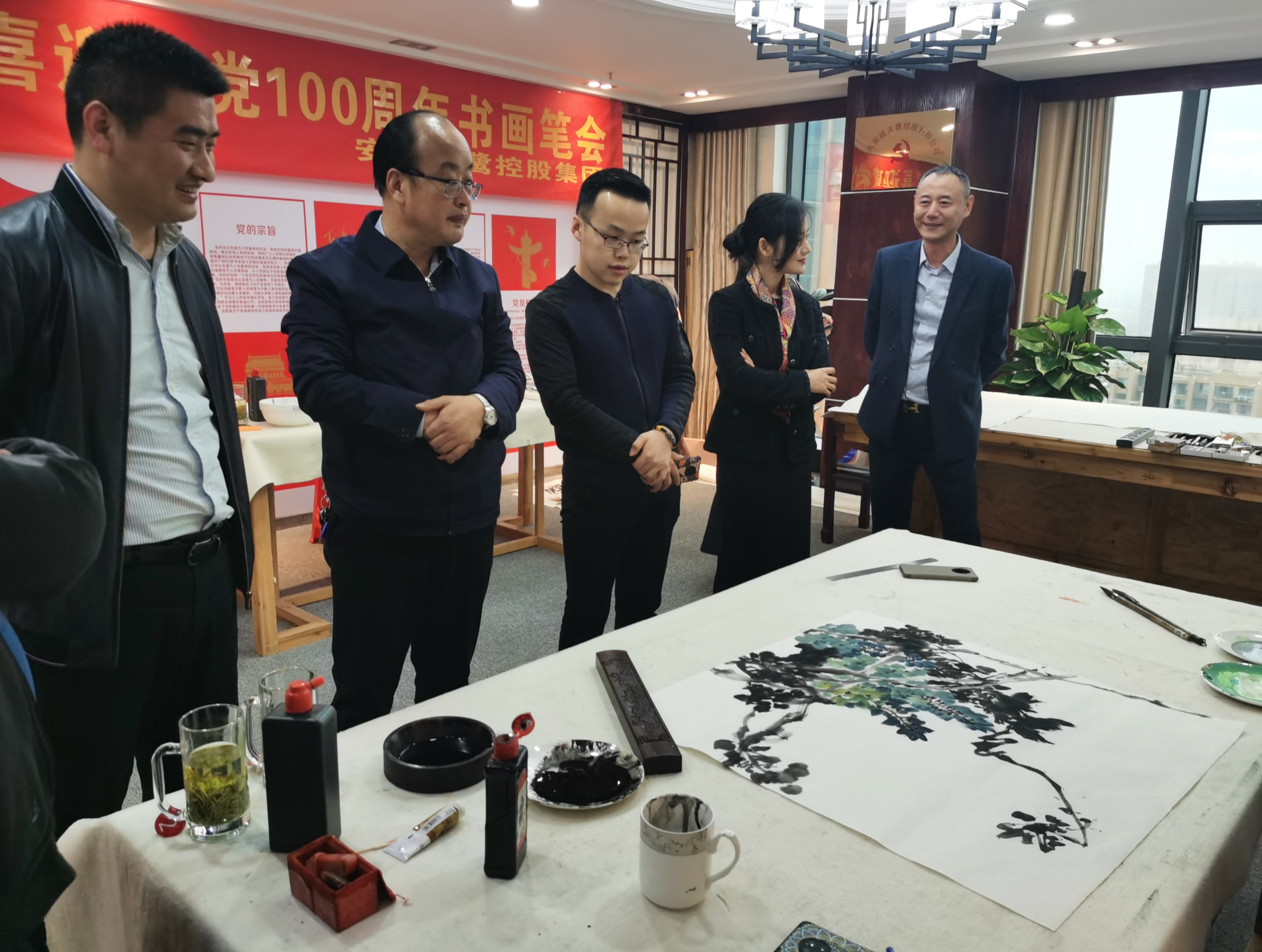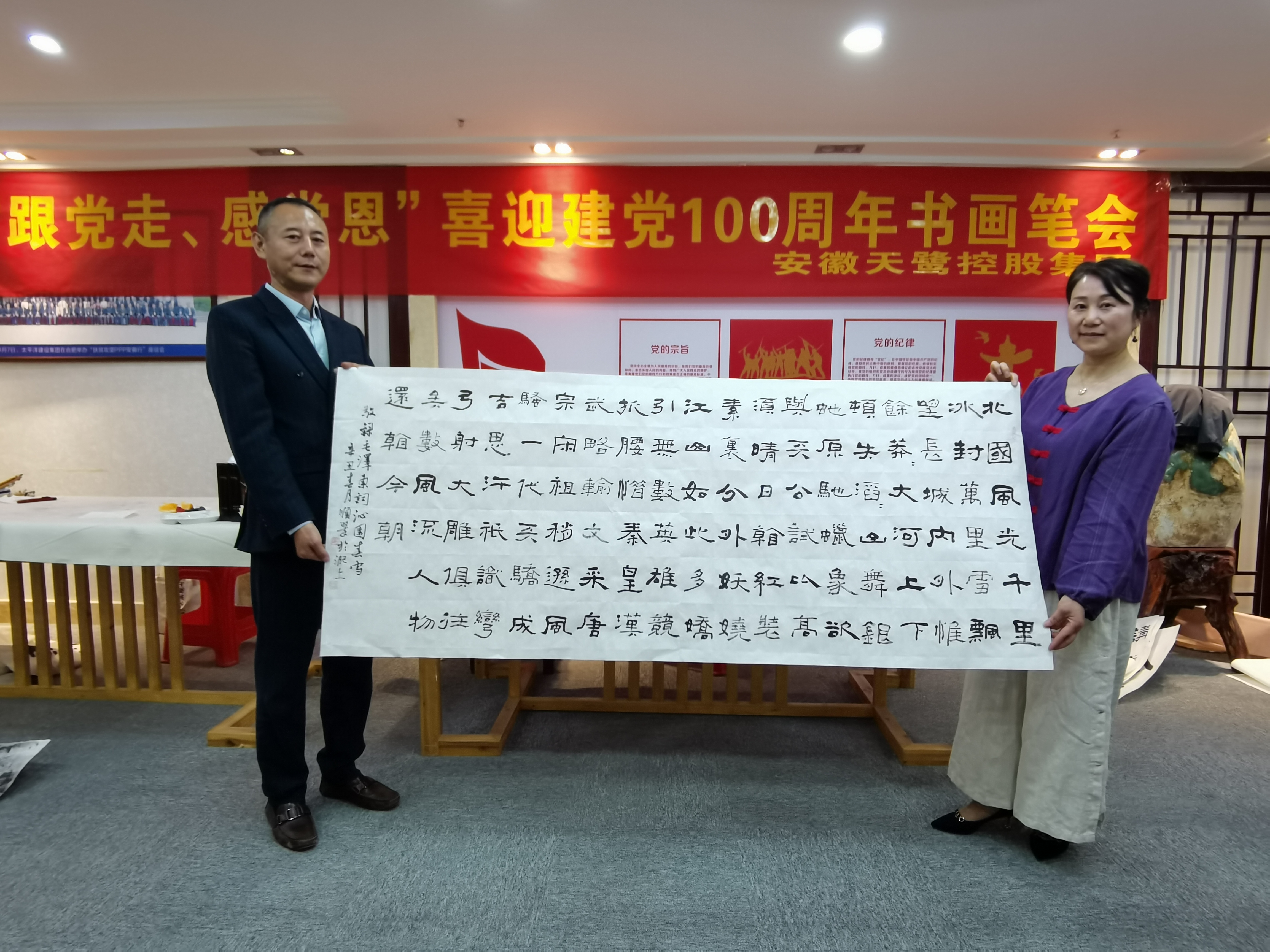 中國美協會員、國家一級美術師、巢湖市美協主席周圣祥,巢湖市政協委員、民建中央畫院院士楊順翠,中國美術家協會安徽省分會會員、國家一級美術師汪瓊,江蘇省書法家協會會員、安徽省青年書法家協會隸書委員會委員李健等書畫家們齊聚安徽天鷺控股集團黨建活動室揮毫潑墨,將對黨的祝福凝聚在筆尖,用牡丹、蘭花、松竹、山水等水墨丹青畫寄托對黨、對祖國的美好祝福,用詩詞、對聯等書法作品回憶黨的崢嶸歲月,向黨致敬,向建黨一百周年獻禮。